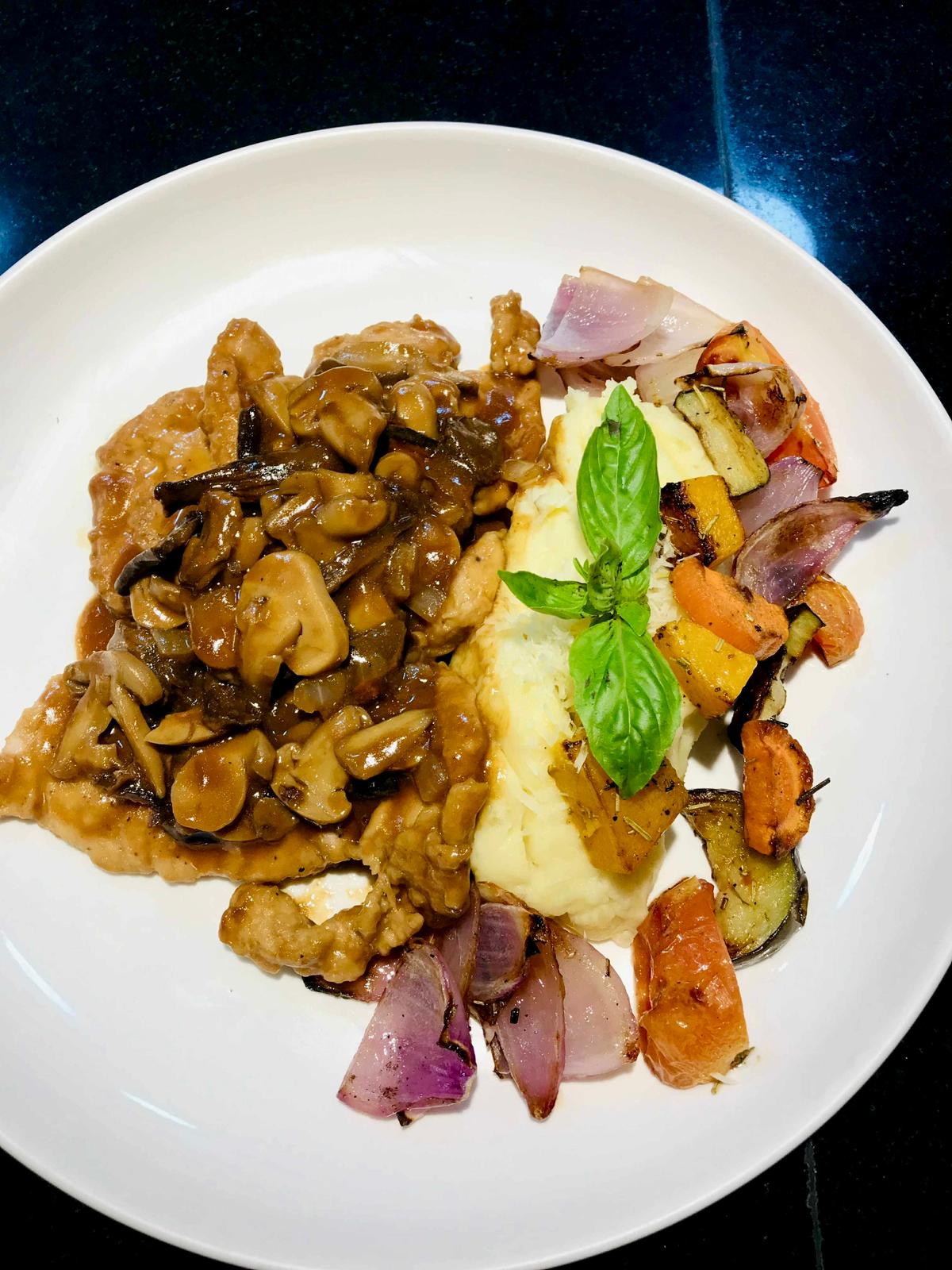 Tender pork medallions sautéed in a creamy mushroom sauce with garlic and fresh herbs. Served with a side of mashed potatoes. Savory, Creamy, Comforting.