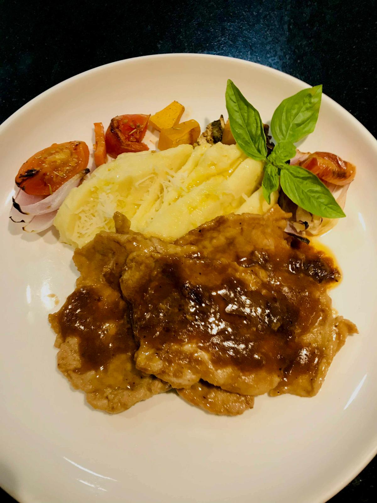 Tender pork medallions sautéed in a rich Marsala wine sauce, accompanied by mushrooms and garlic. Served with a side of creamy mashed potatoes. Savory, Aromatic, Comforting.